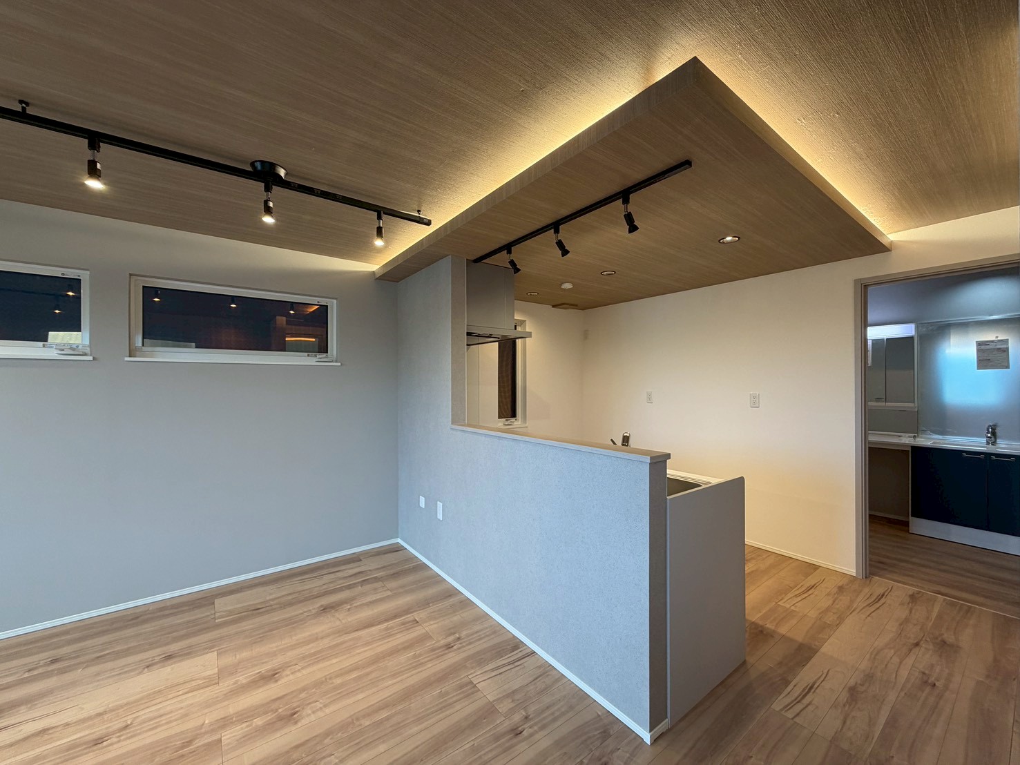 間接照明とポップアップ天井でラグジュアリーに演出するキッチン。